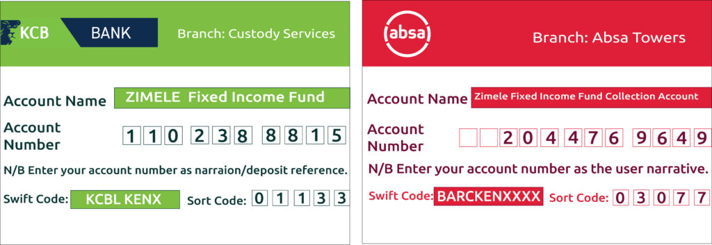 Branch: Custody Services Account Name: Zimele Fixed Income Fund Account Number: 1 1 0 2 3 8 8 8 1 5 SWIFT Code: KCBL KENX SORT Code: 01133 |