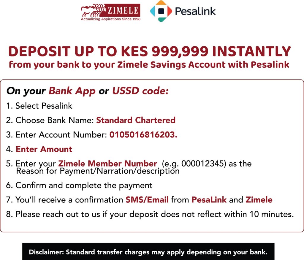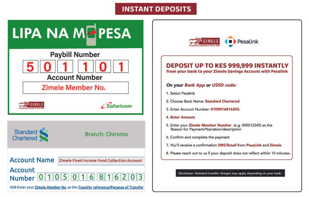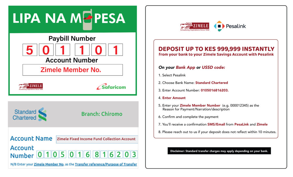 Branch: Chiromo Account Name: Zimele Fixed Income Fund Collection Account Account Number: 0105016816203 SWIFT Code: SCBLKENXXXX SORT Code:02084 |