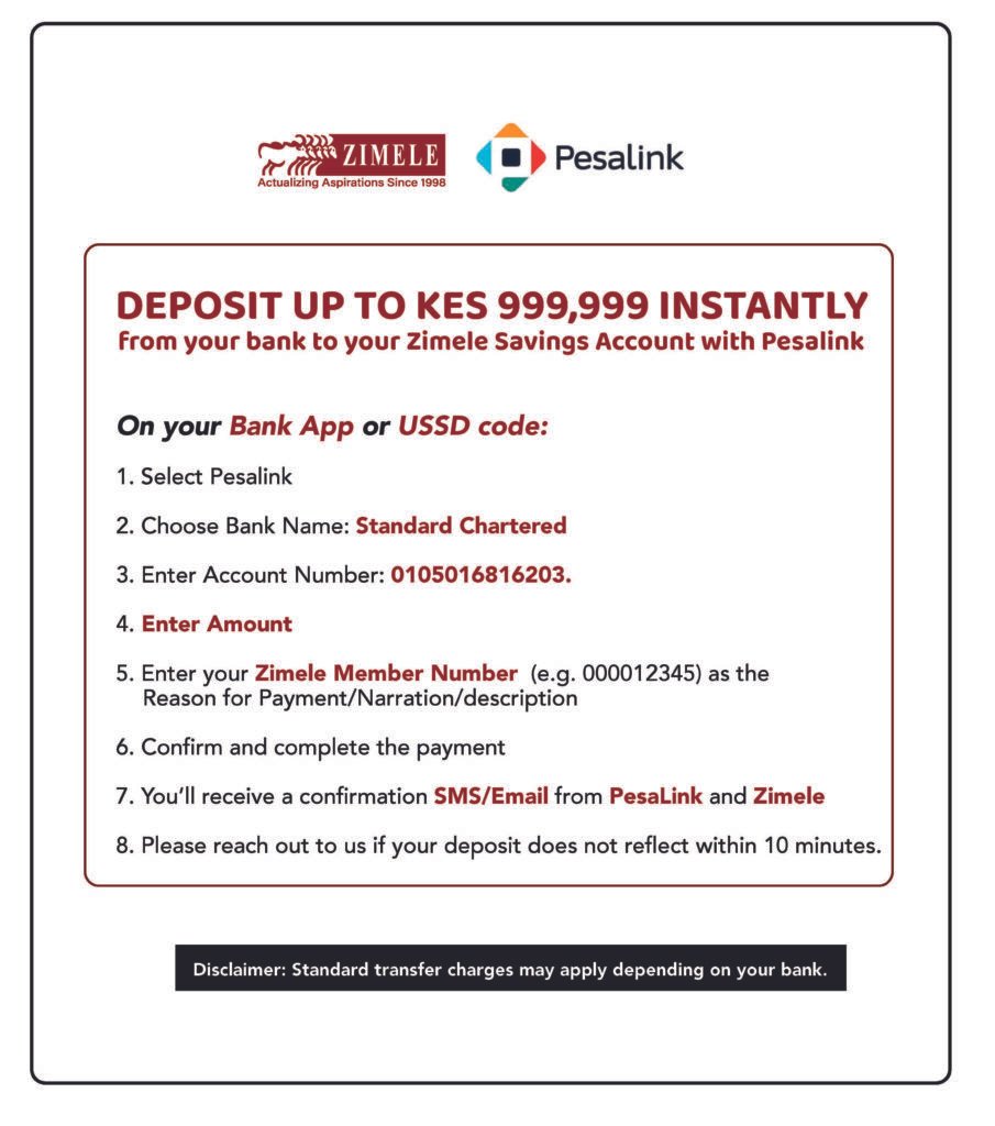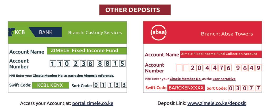 Branch: Absa Towers Account Name: Zimele Fixed Income Fund Collection Account Account Number: 2 0 4 4 7 6 9 6 4 9 SWIFT Code: BARCKENXXXX SORT Code: 03077 N/B: Enter your account number as the user narrative. |